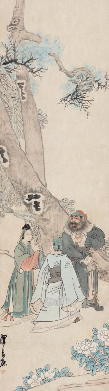 清代后期,特别是1840年鸦片战争之后,上海、广州等地成为“通商口岸”,国内外新的绘画消费群体,吸引了众多画家聚居。市场审美重心的转移,促使画家们在题材取向和艺术手法上都发生了变化。苏六朋(1798—1875),字枕琴,广东顺德人。受黄慎影响,其粗笔人物多画社会现实民众生活。《盲跎图》(1836)以极简的笔墨勾染,写一沿街打锣卖卜为生的盲人,谐谑中隐含着同情与怜悯。任熊(1820—1864),字渭长,浙江萧山人。得宋画神髓,笔力雄健,气质静穆。《风尘三侠图》以隋唐时期虬髯客、李靖、红拂女故事为蓝本,写三人于大树下依依惜别的情景,画面简洁空灵。属于华嵒传脉之王素(1794—1877)的《竹石人物图》、改琦之子改篑的《仕女图》(1873),则是工笔细写,精致妍丽。以古代文学名著为蓝本,进行绘画创作,是此一时期流行的热门。陈崇光(1839—1896),字若木,扬州人。《承天夜游图》以苏轼名篇为据,写二文士于大柏树下闲步之情境。沙馥(1831—1906),字山春,苏州人,笔致妍秀、精到。《春夜宴桃李园图》(1893)以李白名篇为据,写李白与四从弟对月吟诗著文种种情态,与仇英同名作品异曲而同工。钱慧安(1833—1911),字吉生,号清谿樵子,上海宝山人。笔意遒劲,气息娴雅。《桃花源图》(1904)以陶渊明名篇为依据,描绘各得其乐的男女老少众多人物,形象生动。倪田(1855—1919),字墨耕,扬州人。初学王素,后习任颐,腴润而遒劲,《钟馗图》(1899)、《秋郊牧马图》(1915)、《羲之爱鹅图》(1916)可见其画风特色,对晚清民国画人颇有影响。此外,赵冕、万岚、胡璋、顾吉安等的人物画也有一定成就。