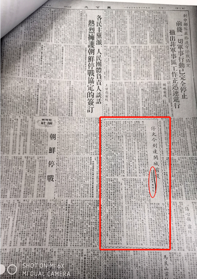 1953年7月29日,《大公报》二版《停火令到达开城前线》,署名本报特派记者贺师尧。