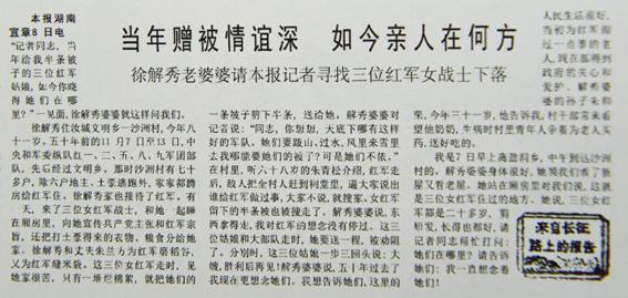 “半条被子”的故事来自经济日报1984年11月14日的一版稿件——《当年赠被情谊深 如今亲人在何方? 徐解秀老婆婆请本报记者寻找三位红军女战士下落》。