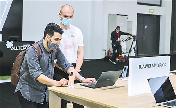 9月3日,在德国首都柏林,一名参观者(左)在华为公司展区体验展出的手机和笔记本电脑。2020年德国柏林国际消费电子展3日开幕。受新冠肺炎疫情影响,今年展会举办时间缩短至3天,并在线上线下同时举行。 新华社记者 单宇琦摄