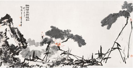 “技艺”(技巧)必须与“画艺”区别开来。技艺是一般的。西方学者科林伍德说:“技巧是可以从仓库里取出来的工具,人人能用。”画艺则是独特的,有创造性。没有技艺,成不了第一流的画家。第一流的画家,必有超出于一般技艺的东西。所以想要更好地欣赏和理解潘先生的作品,不能不知一般性的“技艺”,即中国画的艺术表现,其特征主要在“笔墨”和“章法”。笔墨在中国画的表现中,是“常”,我虽已多次谈过,此处仍需一提。所谓知常达变,不知常何来变?