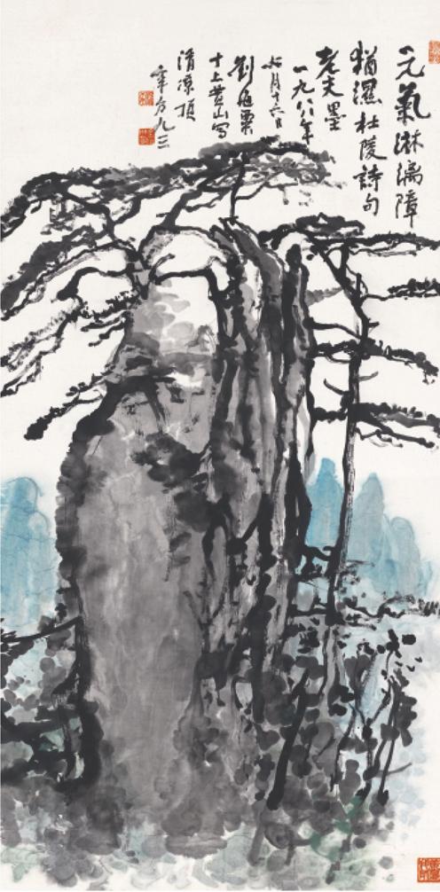款识:元气淋漓障犹湿。杜陵诗句,老夫墨。一九八八年六月十六日,刘海粟十上黄山写清凉顶。年方九三。